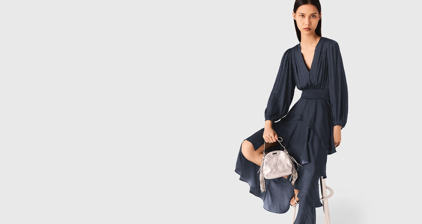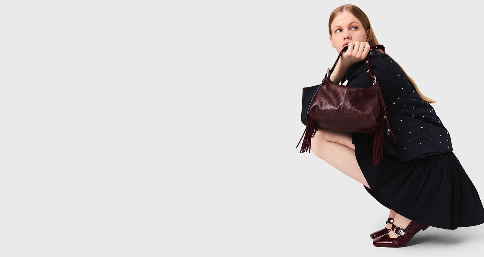 The Maje girl moves through Paris, radiant and free. Evoking the spirit of the Palace years, she glows in velvet, tulle, and shimmering rhinestones, catching the light with effortless elegance.