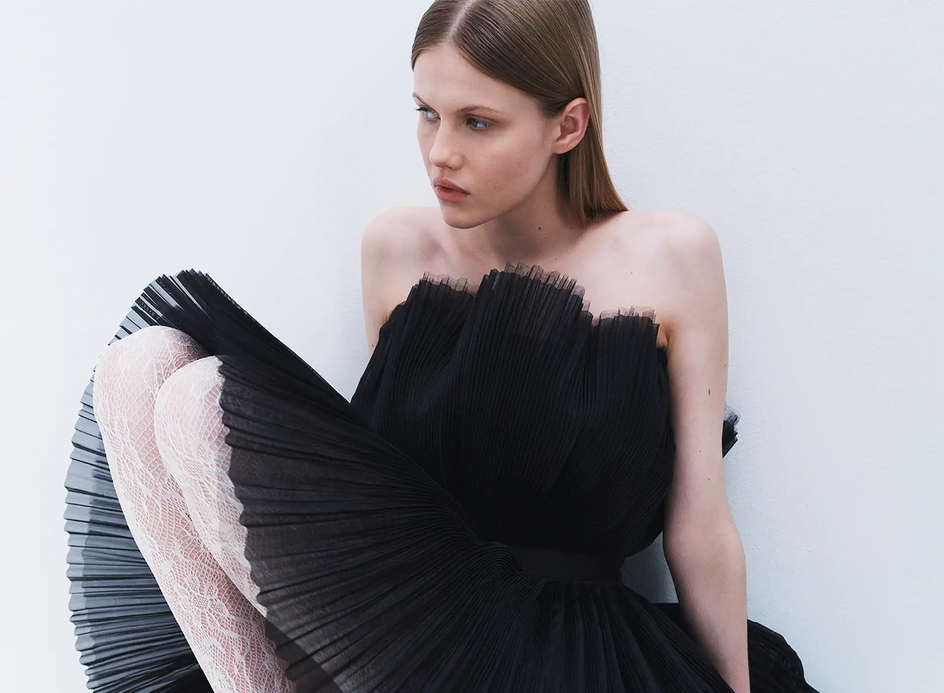 Bring an exceptional flair to your festive wardrobe with contrasting pieces reflect both sensuality and modernity: a flowing jumpsuit, a pleated tulle mini dress, an embroidered sparkling suit, a couture velvet bodysuit, and graphic heels.